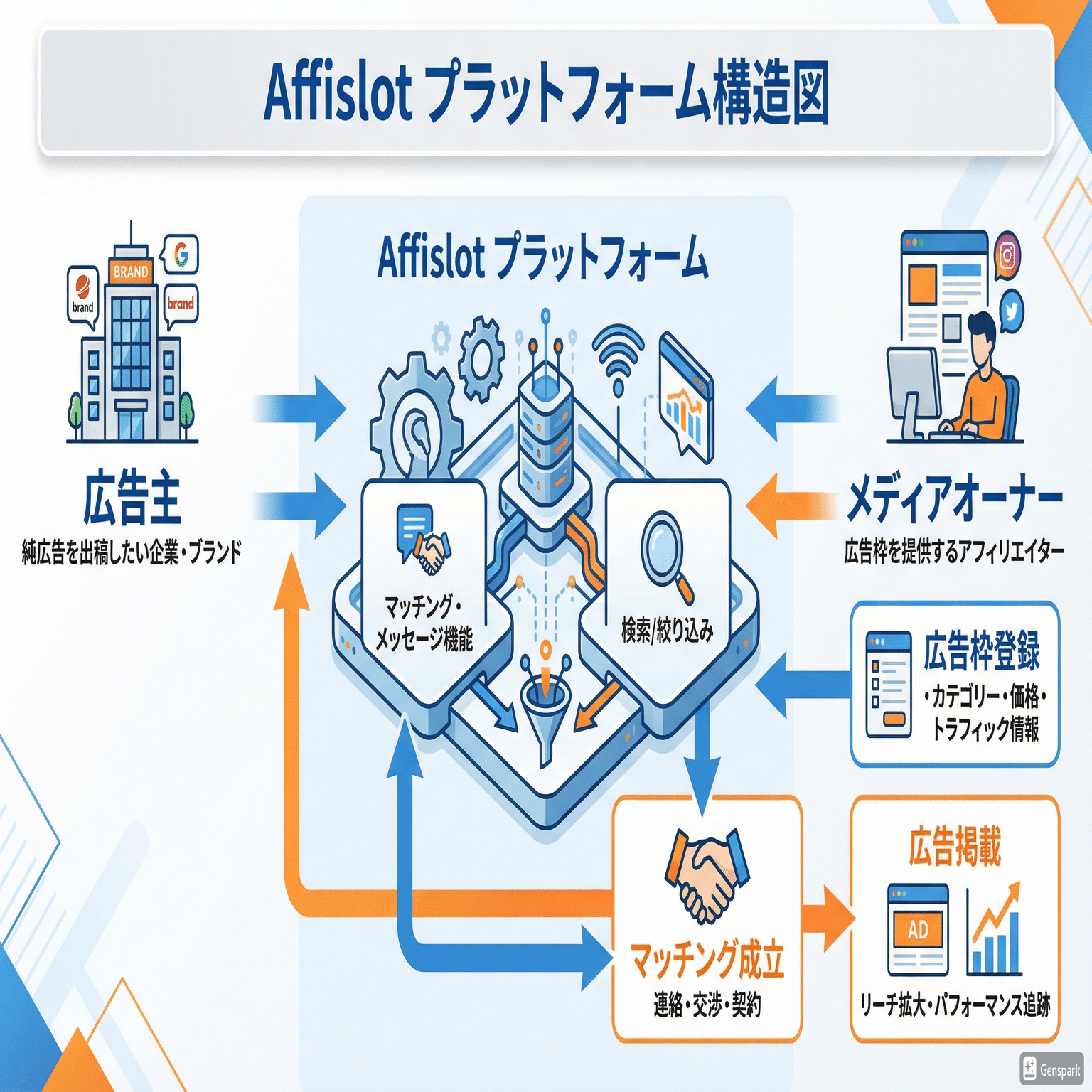 純広告を出稿したいメディアとそのメディアに純広告を掲載したいアフィリエイターをマッチングするプラットフォームです。